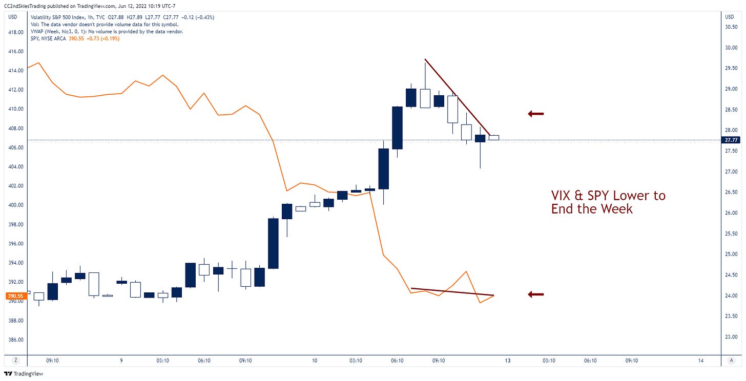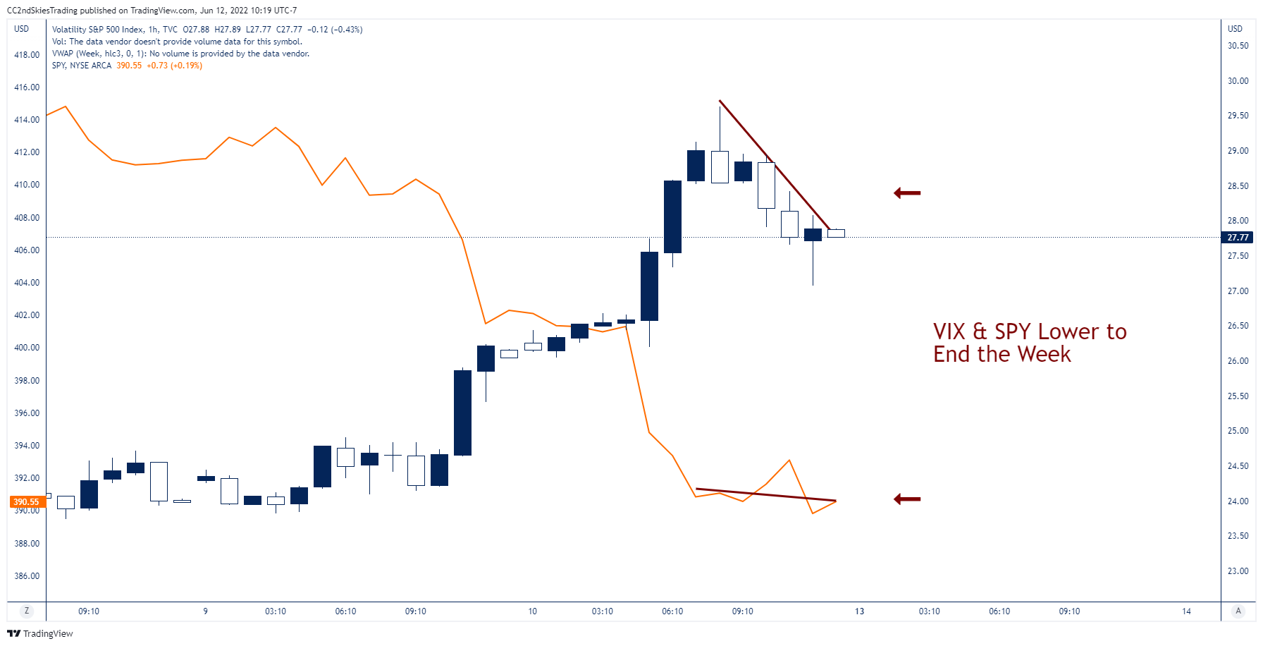 VIX almost hit 30 on the week before pulling back on Friday, even though SPY’s continued lower in the last 6 hours of trading (meaning they both traded lower).